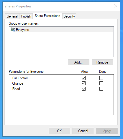 4.- Open System Tools, Shared folders, Shares. Right click your share (in our example, /data/users and /data/shares), right click, properties and select “Share Permissions”. Make sure “Everyone” has full control (seDiskOperatorPrivilege privilege granted is needed to interact with this tab if you are not using an admin account).