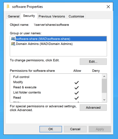 3.-Right click properties, and select “Security” tab. Add your groups and / or users you want to have access to. I recommend using groups, and adding or removing users to that group in order to gain access. The “software-share” group has “Modify” access to the folder. (Remember to assign a gidNumber to this group if you are using the 'ad' idmap backend in this server)