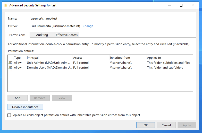 4.-We have configure samba (in smb.conf) to inherit permissions (folders inherit permissions from parents), so sometimes you may need to disable inheritance. If you do, click on Advance, and then “Disable Inheritance”