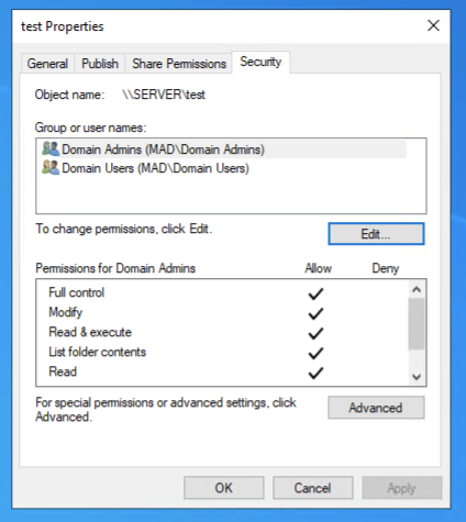 5.- Select now Security. Have “Domain Admins” have “Full Control” and “Domain Users” (or the group you require) have “Modify” or anything more restrictive you see fit.